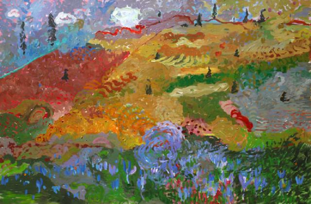 Peisaj alpin cu brânduşe | Acril pe pânză | 120x150 cm