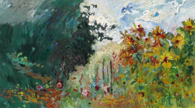 Grădină lângă pădure | Ulei pe pânză | 70x120 cm